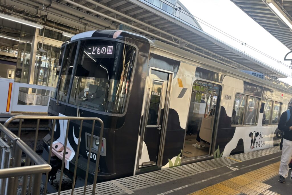 こどもの国線では「うしでんしゃ」というカワイイ電車に乗って向かいました。車内には牛の足跡らしきものがあり、楽しい演出が施されてました。