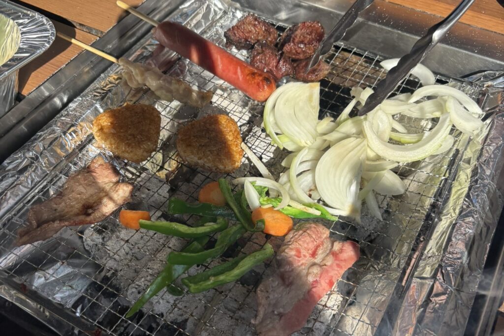 食材は持ち込み可能で、お肉、野菜はもちろん、焼き鳥、フランクフルト、焼きおにぎりを持ち込みました!