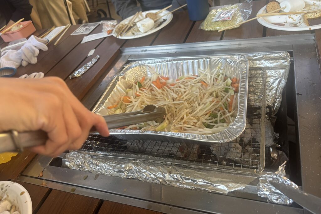 今回は、利用者さんに野菜仕込み、肉焼き、焼きそばづくりなどをお手伝いいただきました。野菜を洗って丁寧にカットし、火加減を見ながらお肉を焼く姿、焼きそばを作る姿は、どれも真剣でありながら楽しさがあふれていました。また、卒業生も参加し、現役生と卒業生の交流の場にもなりました!