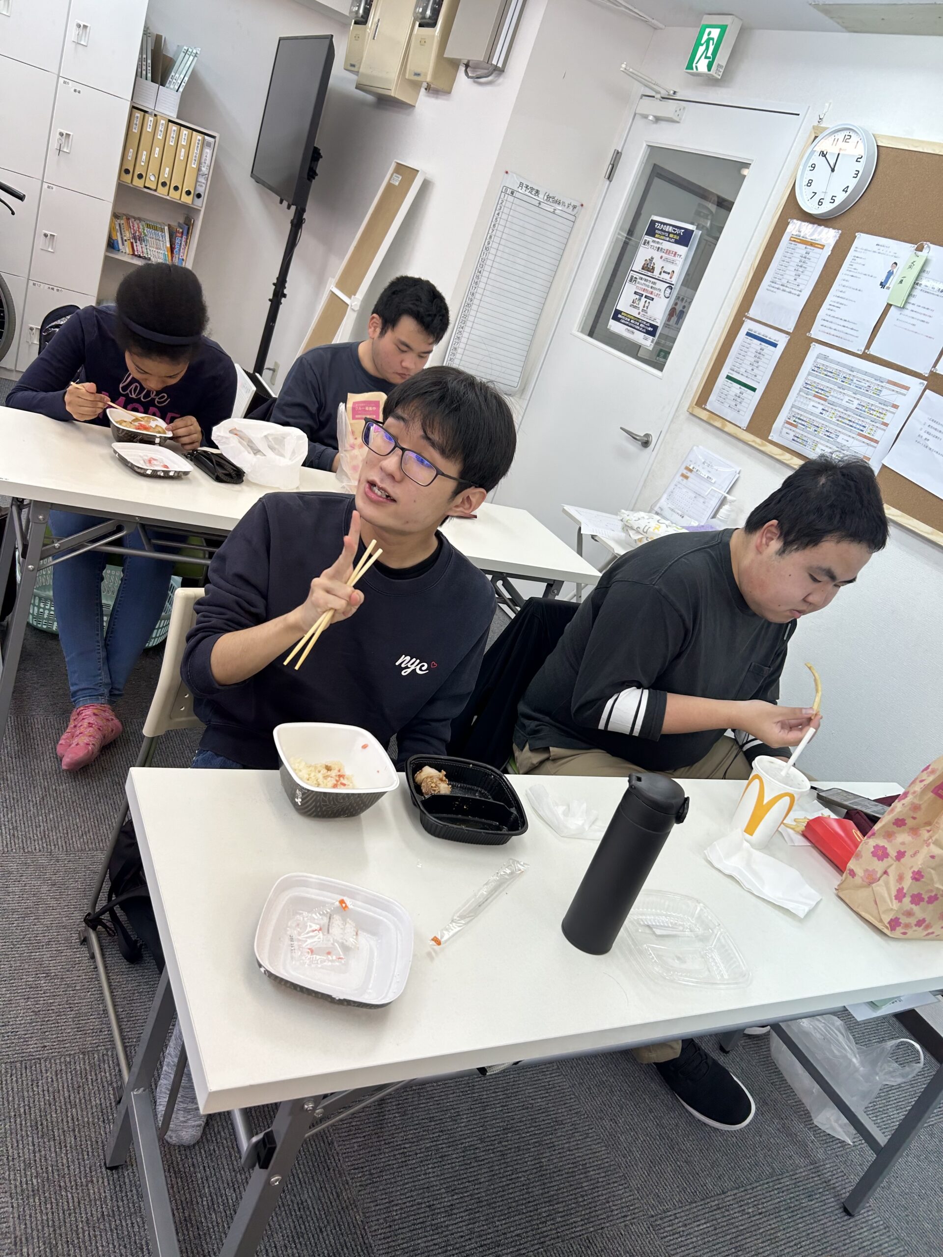事前にどんなものが食べたいか伺うと、ファストフードの希望が多数!さすがみんな若いです!横浜駅でケンタッキー、マクドナルド、インドカレー屋、ガスト、吉野家へお店にごとのグループに分かれて行っています。