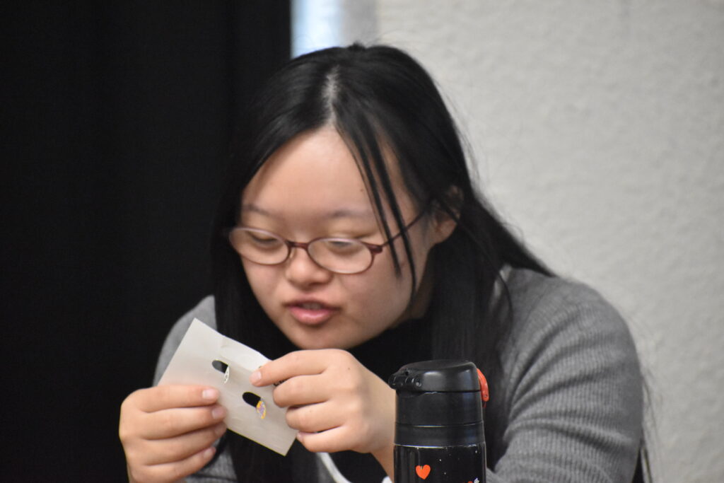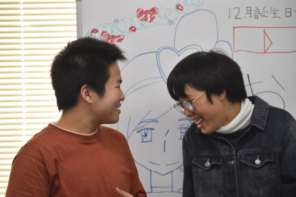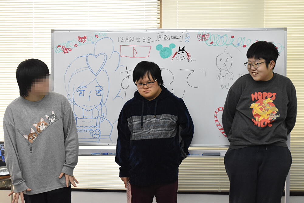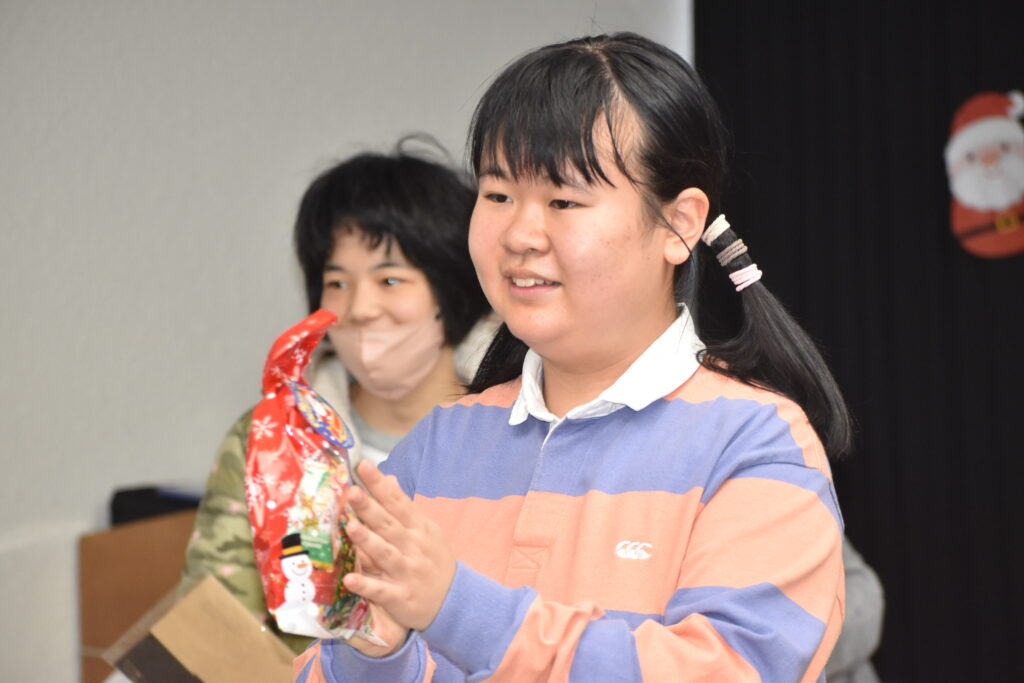 無事、プレゼント交換が終わり校舎に戻ってレクリエーション。そして12月誕生日の方のお祝い。1年の抱負を述べ、みんなから「おめでとう」の言葉をもらって照れながらも、とても良い笑顔をみせてくれました。