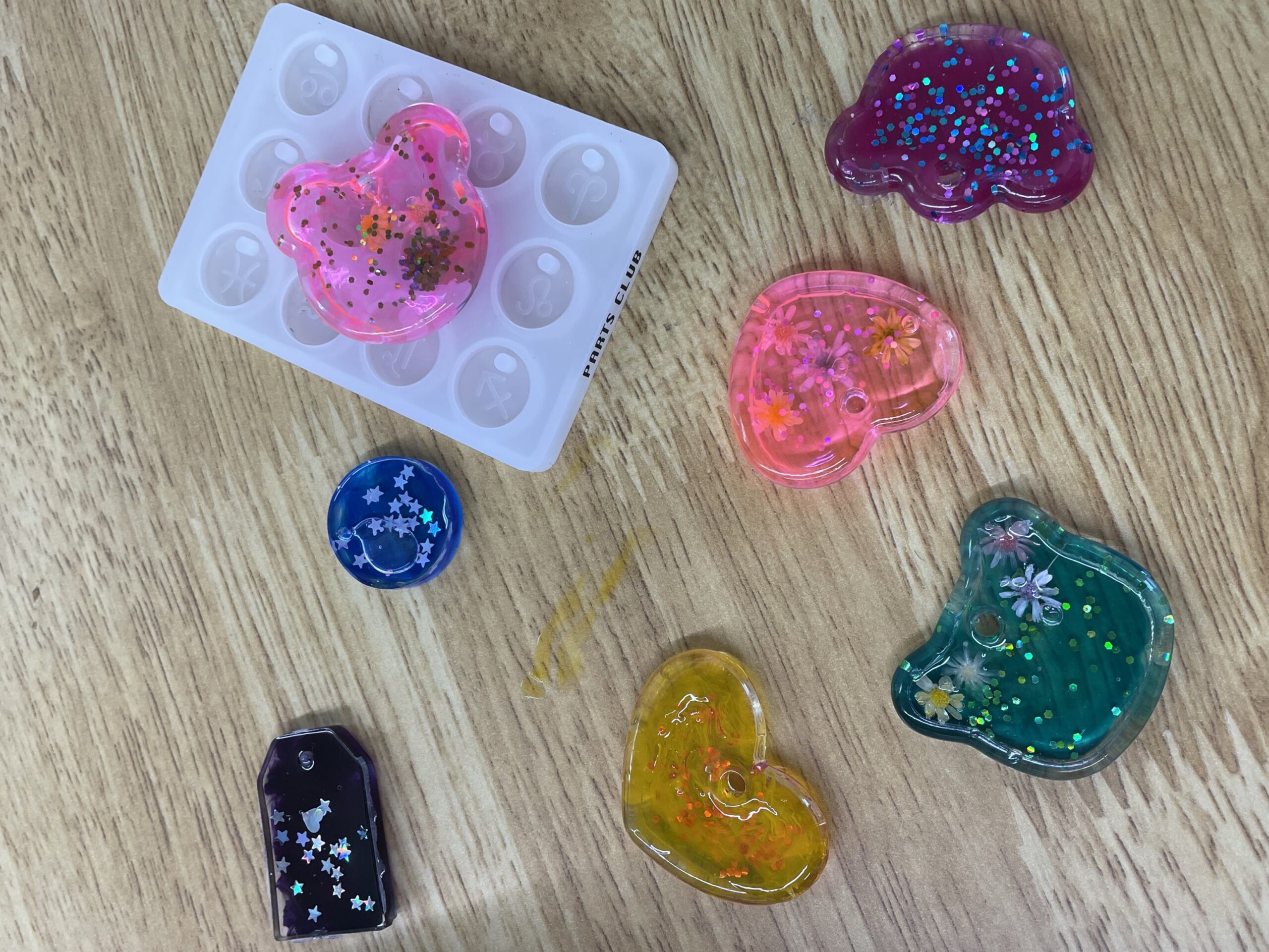 今回の活動では、キーホルダーを作りたい!という意見を受け、レジンによるオリジナルのアクセサリー作りに取り組みました。