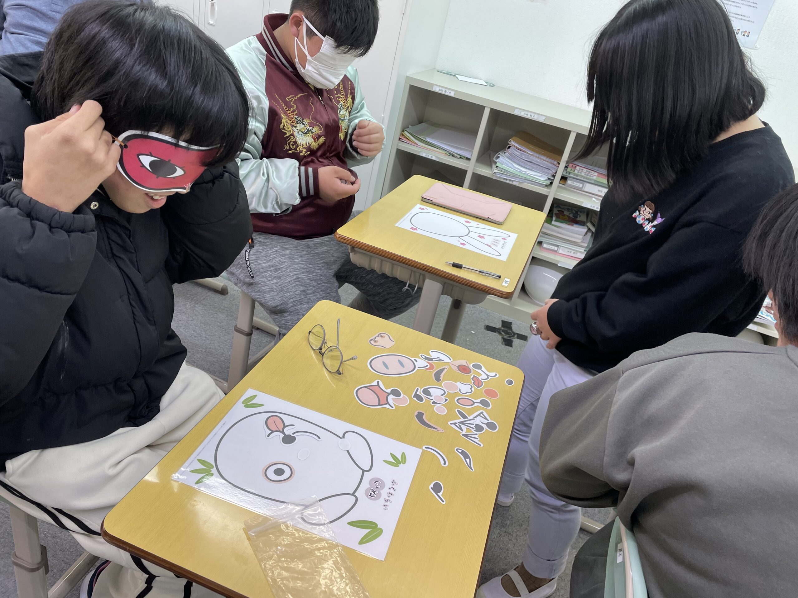 2人1組となり、目隠しをした人に、目や鼻のパーツを教えながら渡していきます。手の感覚でパーツを配置していくので、思わず笑ってしまうような顔がたくさん作られていました!