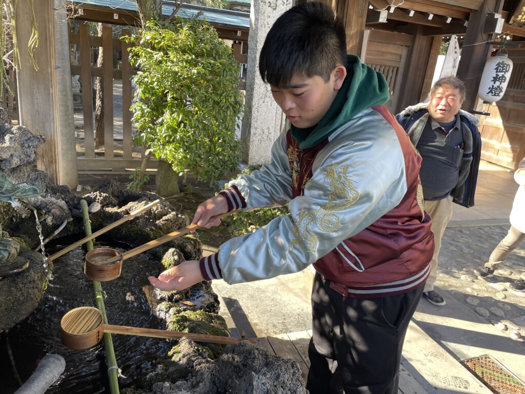 神社に着いたら、簡単なマナーを確認し・・手水を行います。冬で冷たい水でしたが、心身を清めることができました。