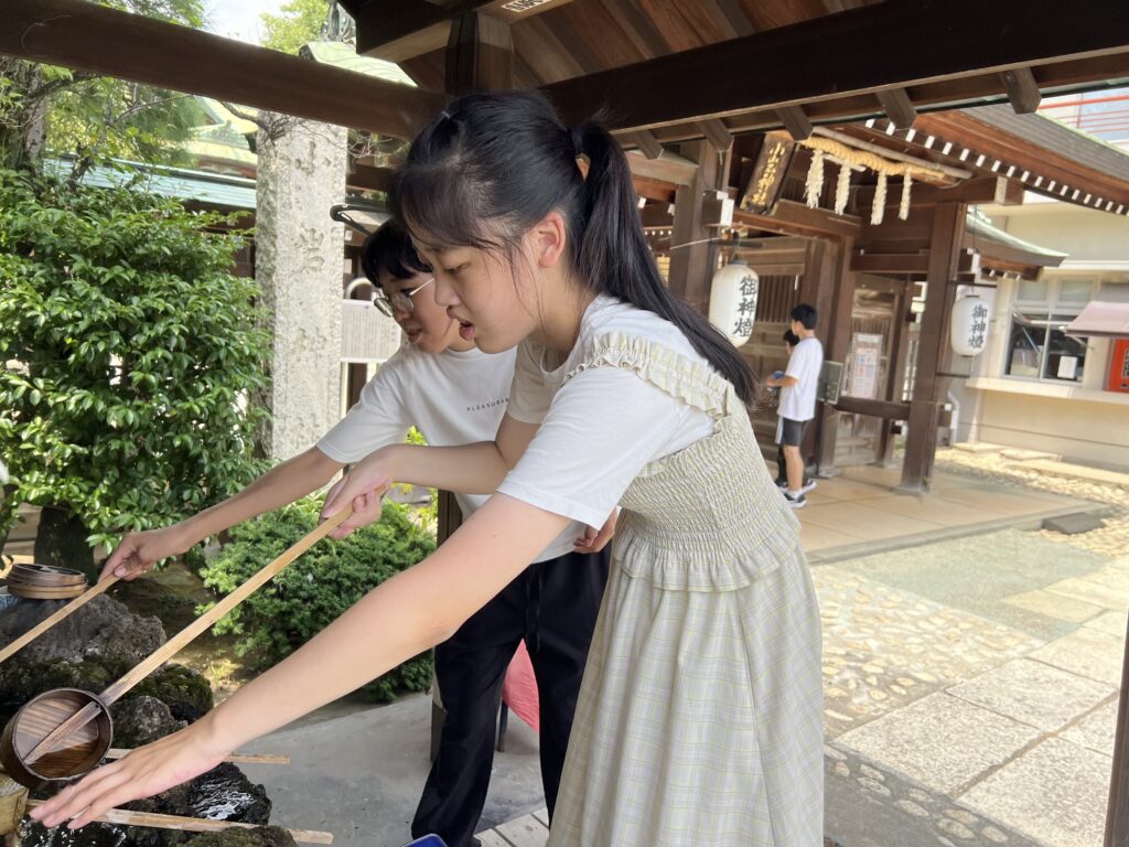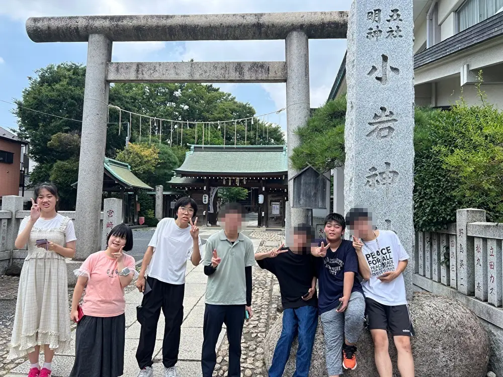 今回は灼熱の東京ということもあり、江戸川キャンパスから5分程度の「小岩神社」にGoogle Mapを使って行ってみました。全員がスマホで同じ場所を検索しているため、音声案内もほぼ一斉に同じ言葉を発します。そうこうしているうちに、あっという間に現場に到着しました。ここからは、神社参拝の作法を確認します。手水舎でしっかりと清めた後、お参りを行います。最後に全員で記念撮影。知識が身につくとともに、夏の思い出もできました。