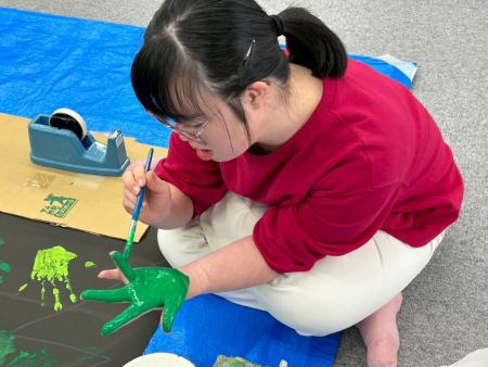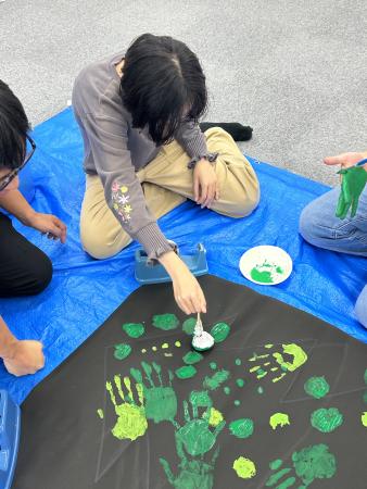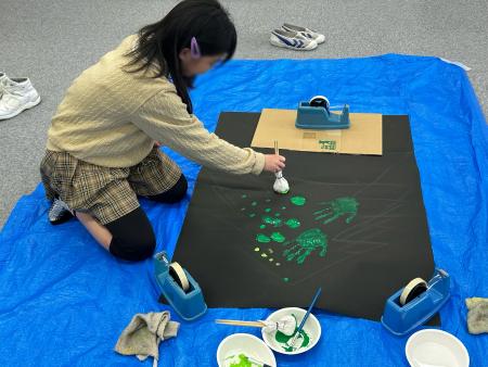 手や指や道具を使って大きな紙にクリスマスツリーを描いていきます🎄