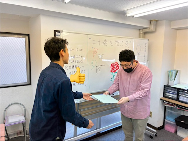 ゆたかカレッジ横浜キャンパスでは、先月1月30日(金)に👍二十歳を祝う会👌を実施いたしました。毎年恒例の年中行事の大事なイベントで、毎回感動をする場面が多いので、私自身もとても楽しみにしておりました。 <準備段階>当日までに、二十歳を迎える各学生さんたちは、自分への手紙、そして日頃お世話になっている保護者への手紙を用意します。授業の中で、職員のサポートを受けながら、思い思いの文章、「感謝のことば」を真剣に書きます。だから、聴く人の心に響くのだと思います。 <アピールポイント>同世代が集まれるカレッジでこその年間行事のひとつ ⇒年齢の幅が大きい他事業所では、人生の先輩たちとの交流から、きっとたくさんの良きものを受け取っている新成人の方々が多いと想像します。ゆたかカレッジには、同年代の人たちがお互いのストレングス(強み)と苦手さ(弱み)を受け入れながら、共通の感覚を多く共有できる環境がそろっています。 <当日の様子> 今回は私が司会の大役を務めさせていただき、緊張する面々を横目に、公式な場面であることが十分に伝わって来る始まりとなりました。何とかリラックスしてもらおうと考え、開始10分前になってから、ホワイトボードに好きなふさわしいイラストを描いて欲しいと伝えました。すると、3人の勇者たちが笑顔で描いてくれたその絵を見て、確かに心の氷が少し溶けたように思います。