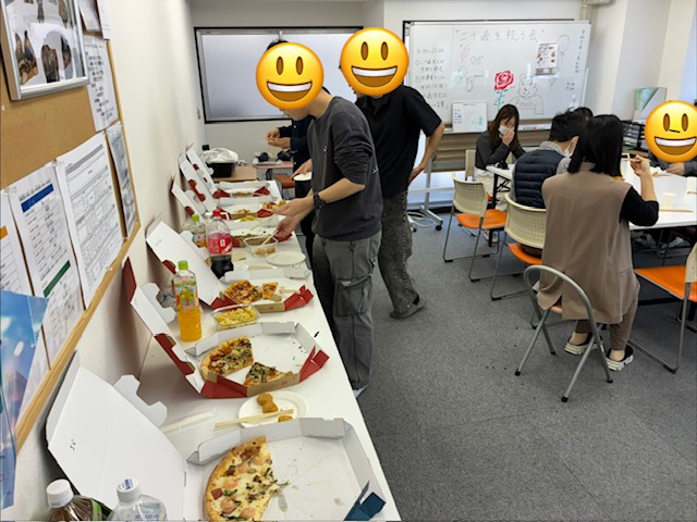 事前に用意していたピザがクラス内に運び込まれると、腹ぺこさんたちは一気にボルテージが上がりますが、その抵抗空しく席に戻されます。一旦食事が始めると、おかわりを求めて、次から次へと立ち上がる学生が・・・アッと言う間に無くなっていた!