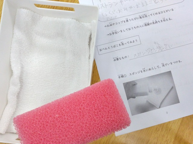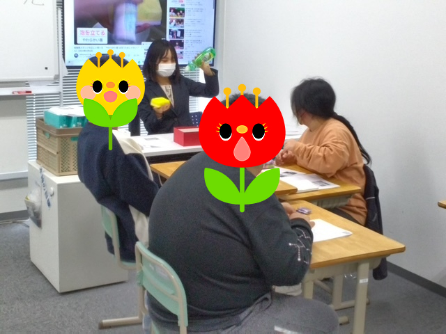 まずは事前学習として、スポンジで泡立てる練習からスタート。