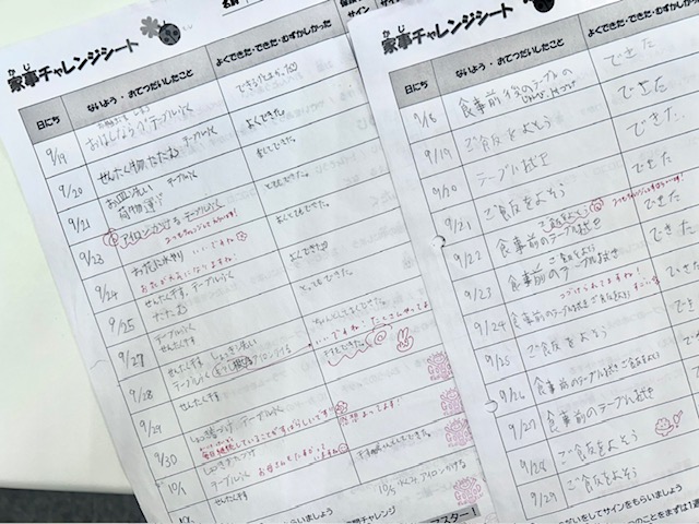 千葉キャンパスでは「家事チャレンジシート」という取り組みがあり、1日1つ、お家での家事にチャレンジしたり、お手伝いに取り組んでいます。初めてのことも多いため、まずは授業内でみんなでやり方を確認してから挑戦します。