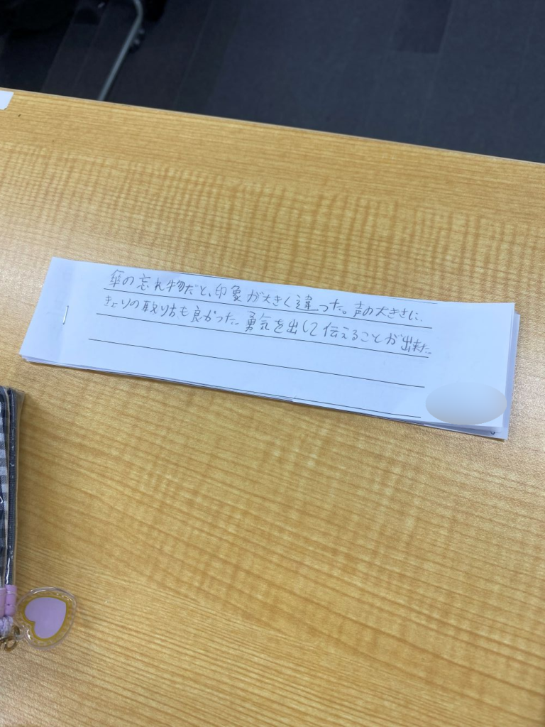 1人ずつロールプレイをして良かったところを書きました。全員が良かったところを書いていてもらった人は「とても嬉しい」「楽しかった」と言う声があり自己肯定感にもつながったようです。