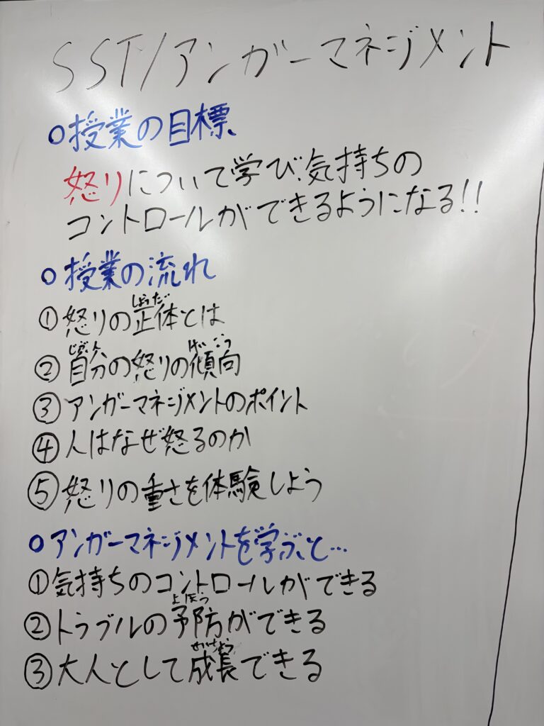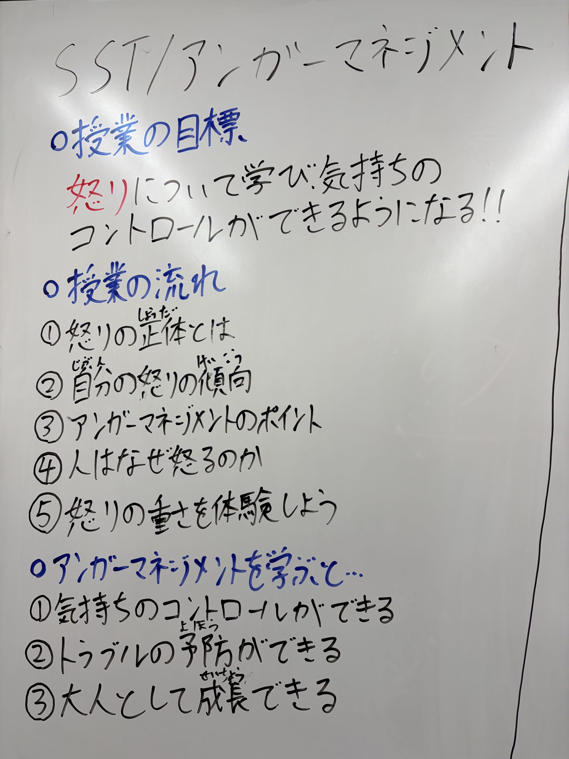 SSTでは3回に分けてアンガーマネジメントを行い、座学にて①怒りとは何なのか②自分自身の怒りの傾向③人が怒る理由などの知識について学んだ後、実技として怒りのコントロールの方法について学び、色々な感情の重さを体感する授業を行いました。