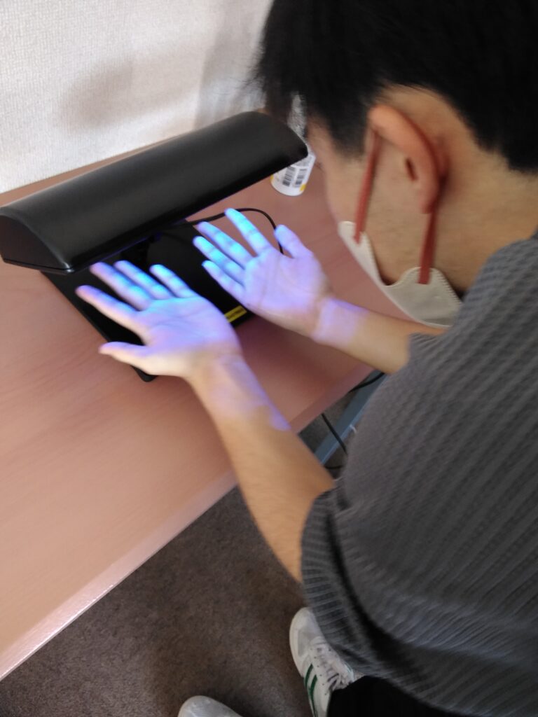 その後洗った手✋を手洗いチェッカーのセンサーにかざし、洗えていない場所をチェックしています。